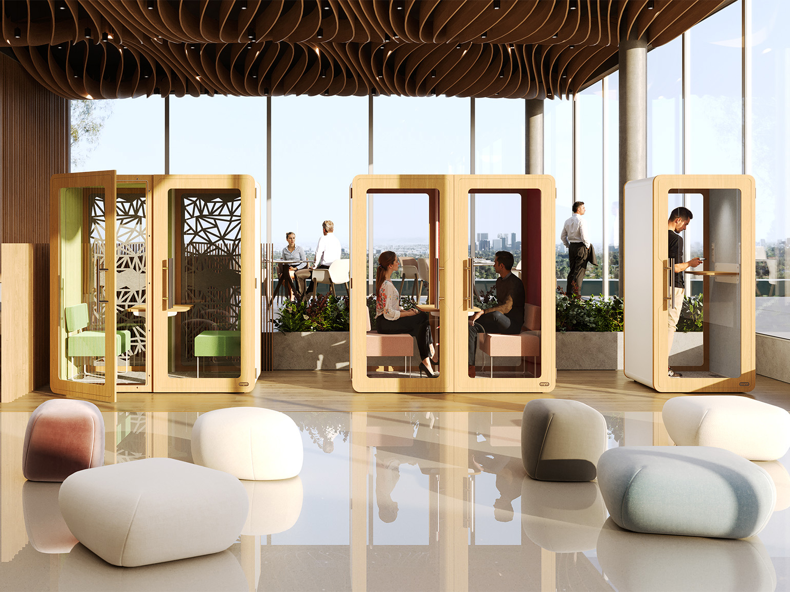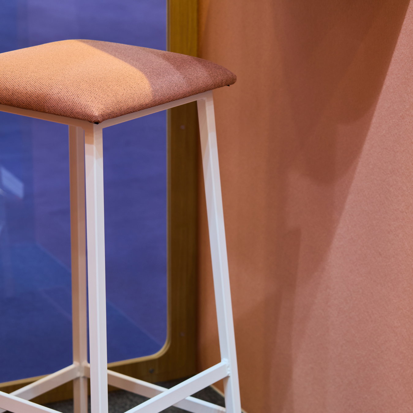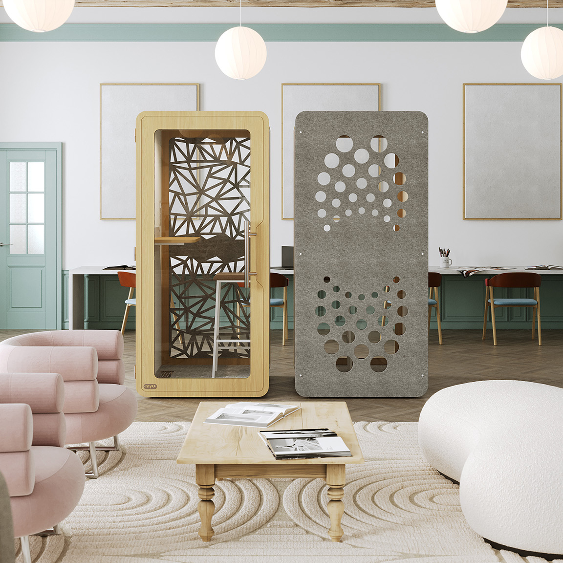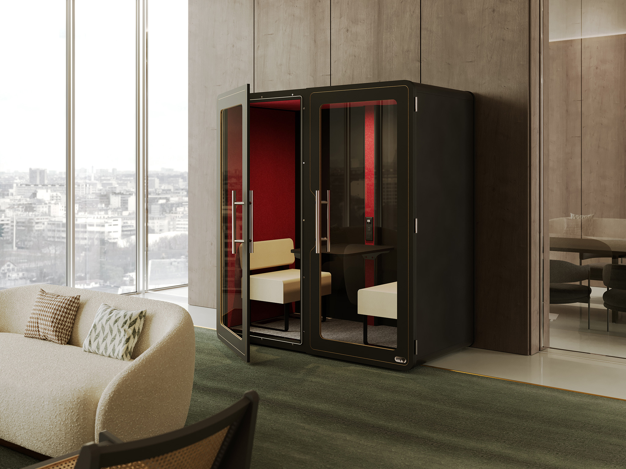 Matériaux : structure en aluminium et panneaux bois pour l’extérieur, cadre et tablette en bois (arbre de seconde vie) et panneaux intérieurs en PET (600 bouteilles recyclées).